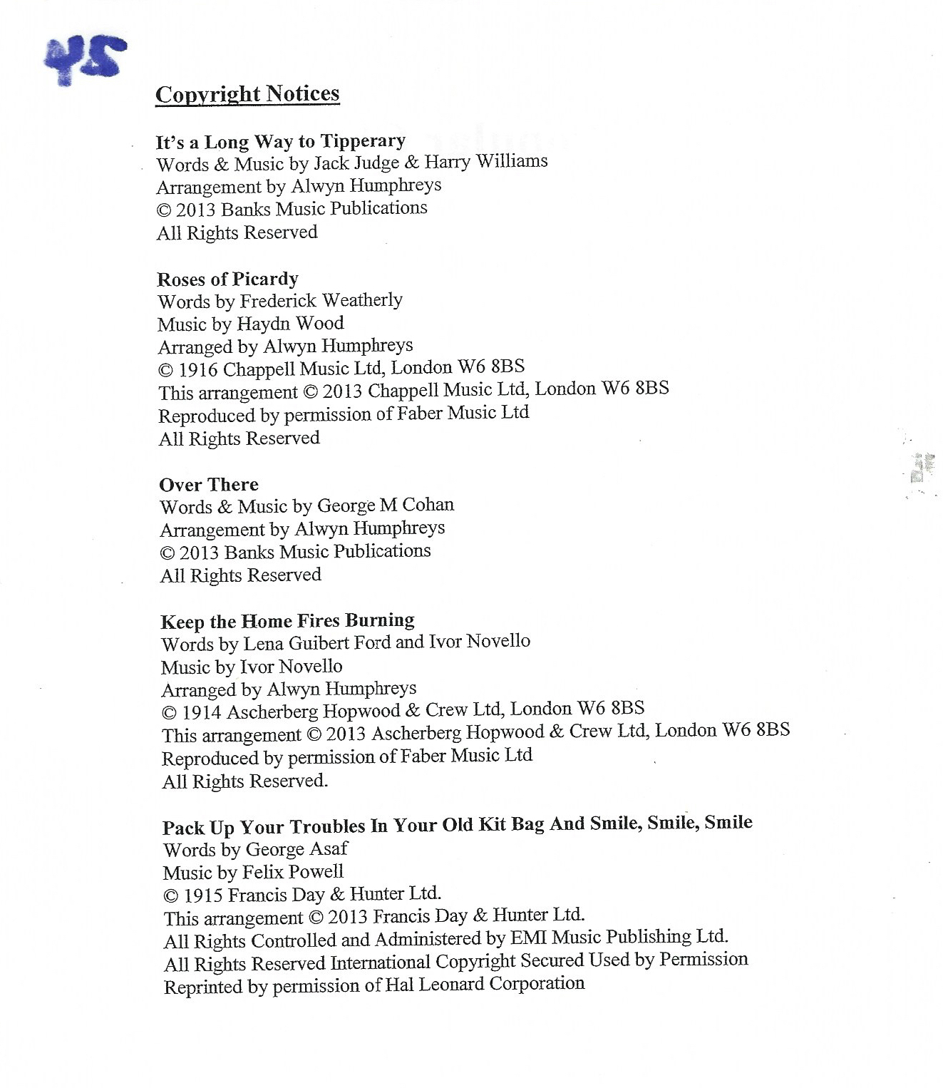 Songs from the First World War – Songlist WW1